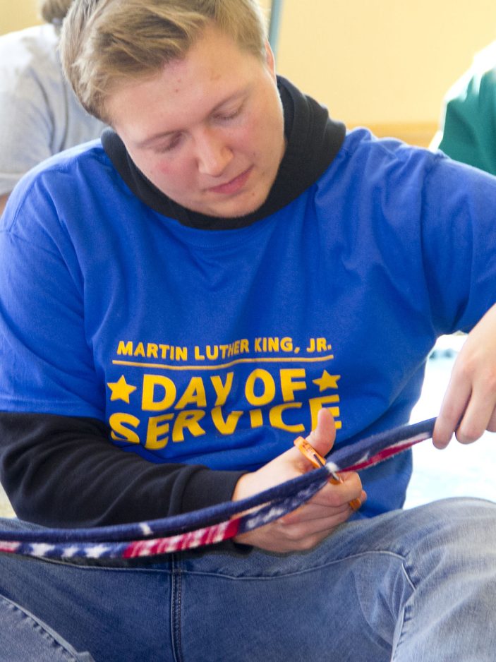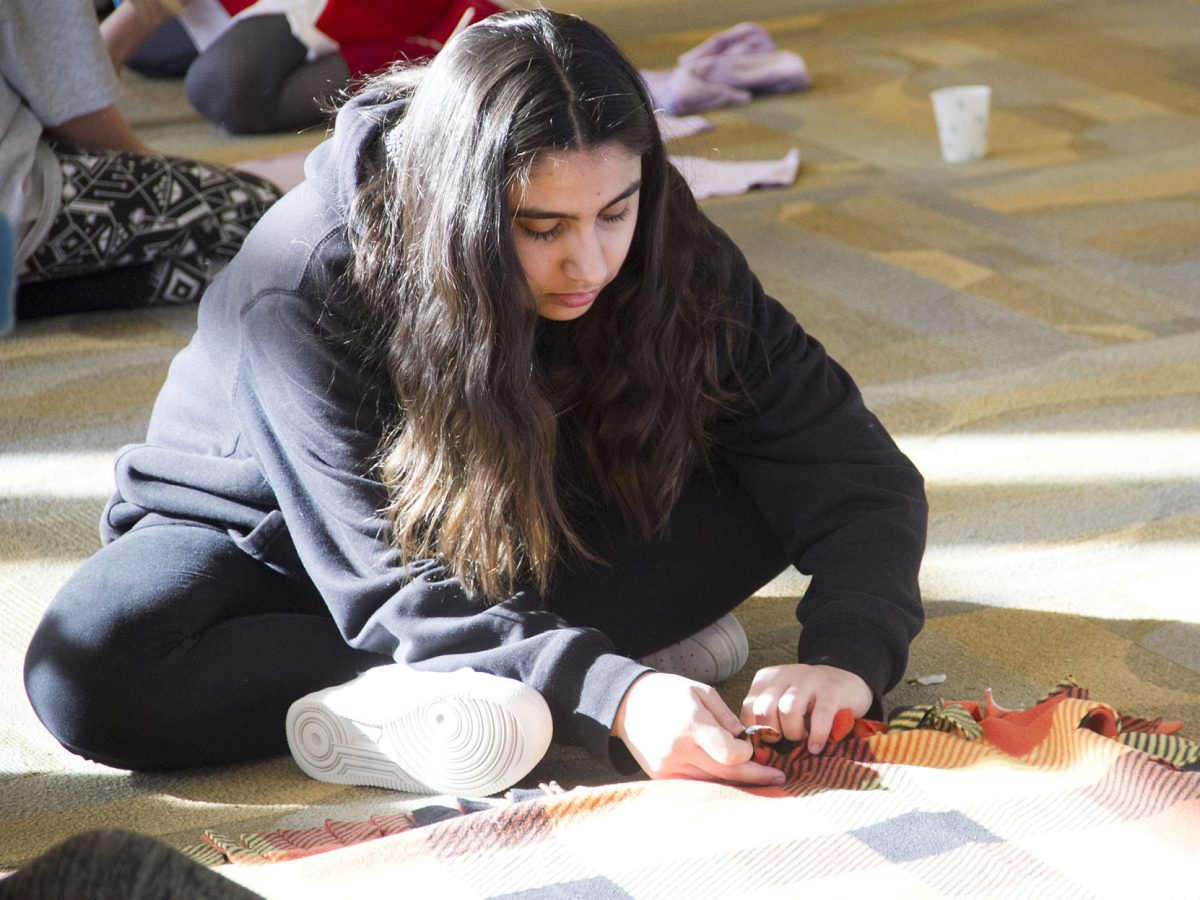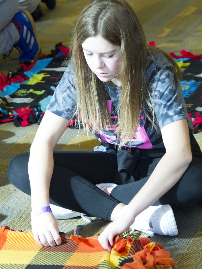 Fort Couch Middle School student Emma Toosi helps prepare a blanket for distribution.