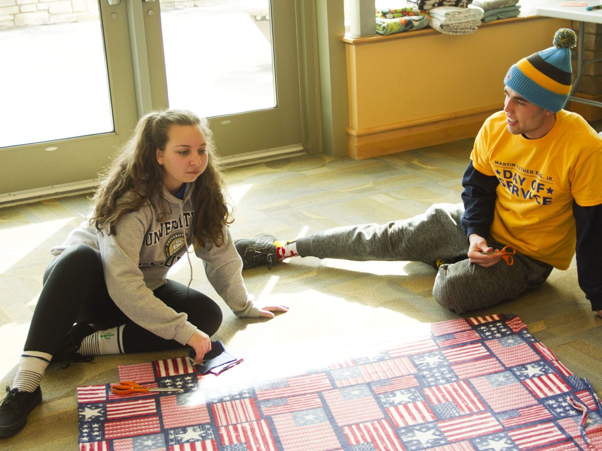 University of Pittsburgh students Sam Sherman, left, and Austin Miller work on a blanket for distribution.