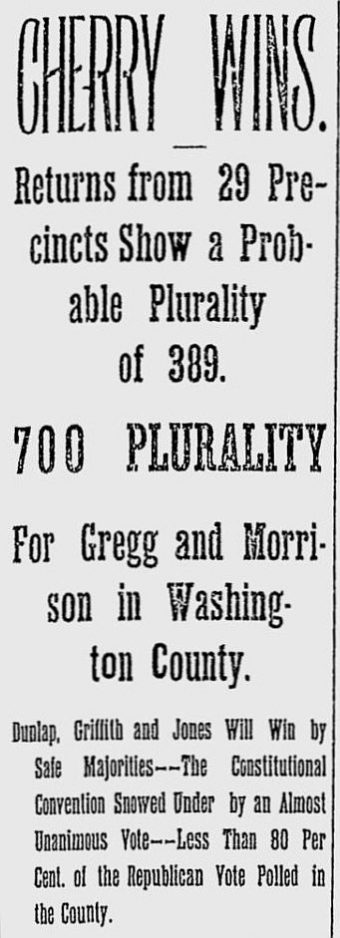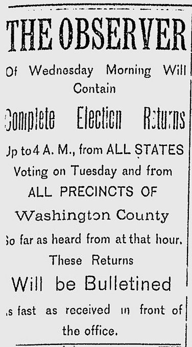 On Friday morning, Nov. 6, the Observer published the confirmed election returns for each of the 71 polling places in Washington County, together with the county totals: the ‘soldier’s ticket’ of Gregg and Morrison carried the county, the call for a constitutional convention was voted down and Cherry narrowly defeated Judson to become the county’s new sheriff.