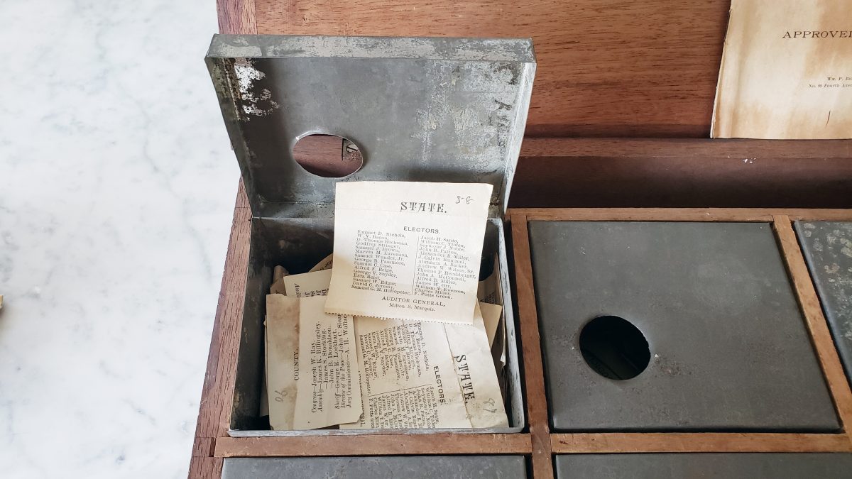 Seeking to know more about the ballot box and its contents, Maggi asked Washington County Historical Society for assistance in unlocking more of its history. The ballot box was carefully transported to the historical society where, after an initial evaluation, the project of cataloging every detail of the box itself, and each ballot found inside, was assigned to South Park native Andy Donatelli, then a student at Washington & Jefferson College, and an intern at the historical society.