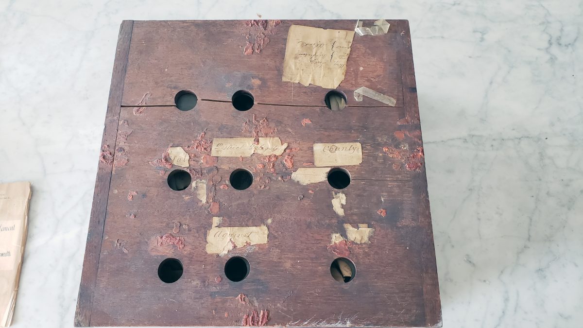But not just any ballot box – a nine-chambered wooden ballot box used in Beallsville elections sometime in the late 1800s. And it was still filled with paper ballots. Greenlee offered to donate the ballot box, including its intact ballots, to the county for historical purposes. At that time, however, it was unclear if the ballots within the box had ever been counted and what the results of those electoral contests were.