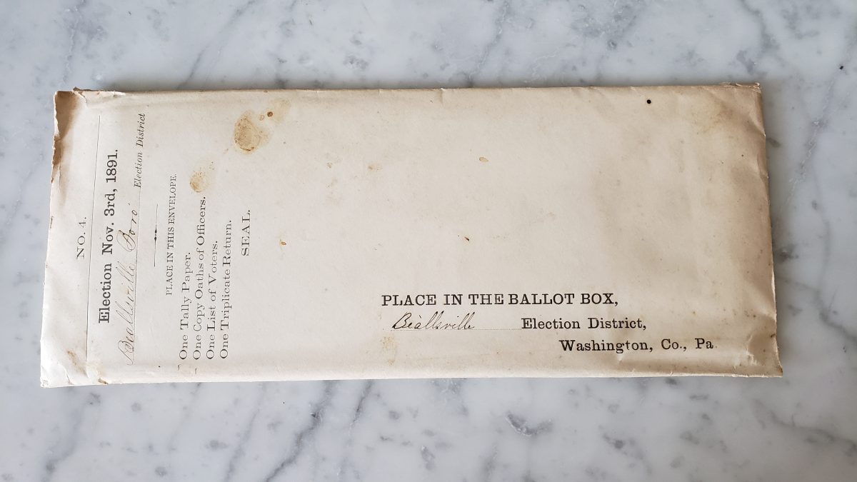 The envelope contains the official list of each individual voter’s name and ballot number, as prepared by local officials on election day in accordance with the Pennsylvania Constitution of 1874. It was sealed at the schoolhouse in Beallsville when voting ended Nov. 3, 1891. And in accordance with the election law as it was then, the envelope was to remain sealed unless the election results were legally challenged. There was no such challenge, and the envelope remains sealed today – 129 years later.