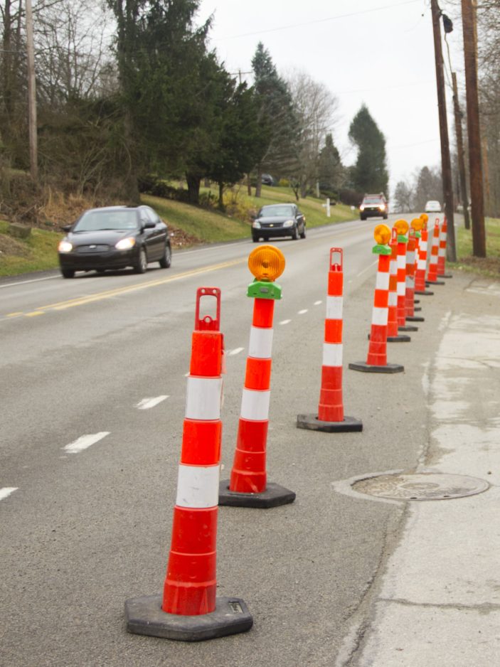 Traffic cones block the entrance to the construction site from East McMurray Road.