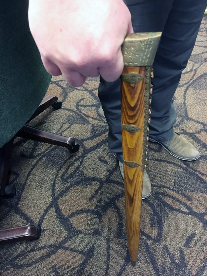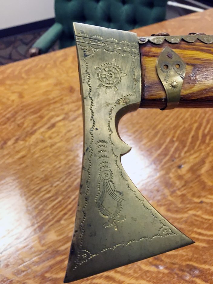 “It was just lying there against a back corner of the wall,” he said of the tool, which appears to be a combination of a hatchet and oak cane or walking stick. One side that appears to have been exposed to moisture is tarnished or oxidized, but the obverse is relatively unscathed.