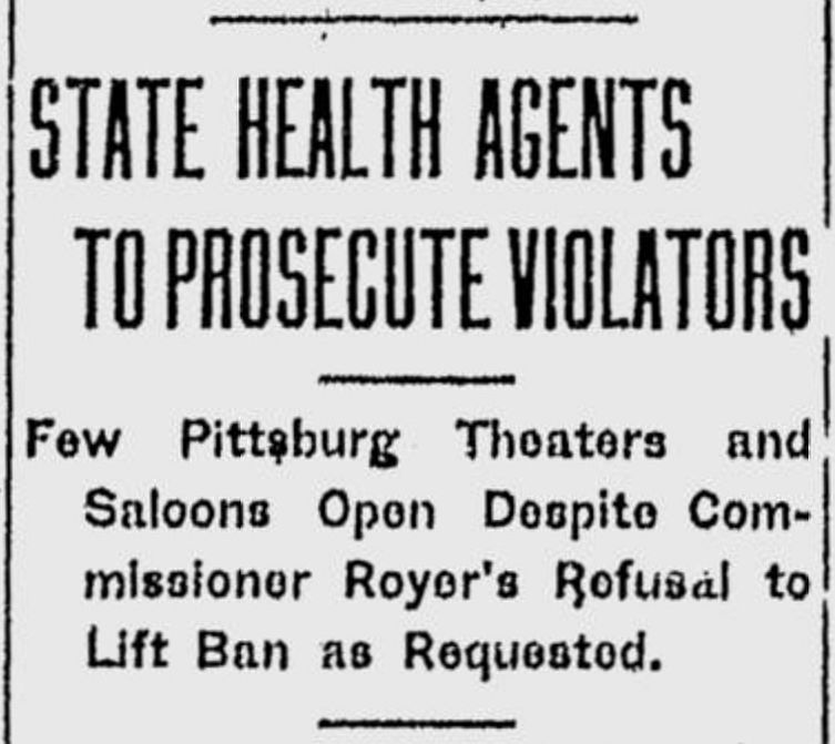 But Royer also appealed directly to Pittsburgh’s saloon and theater owners by stating he would refrain from taking punitive action “until it is definitely ascertained that the closing order has been violated,” in consultation with the state attorney general.