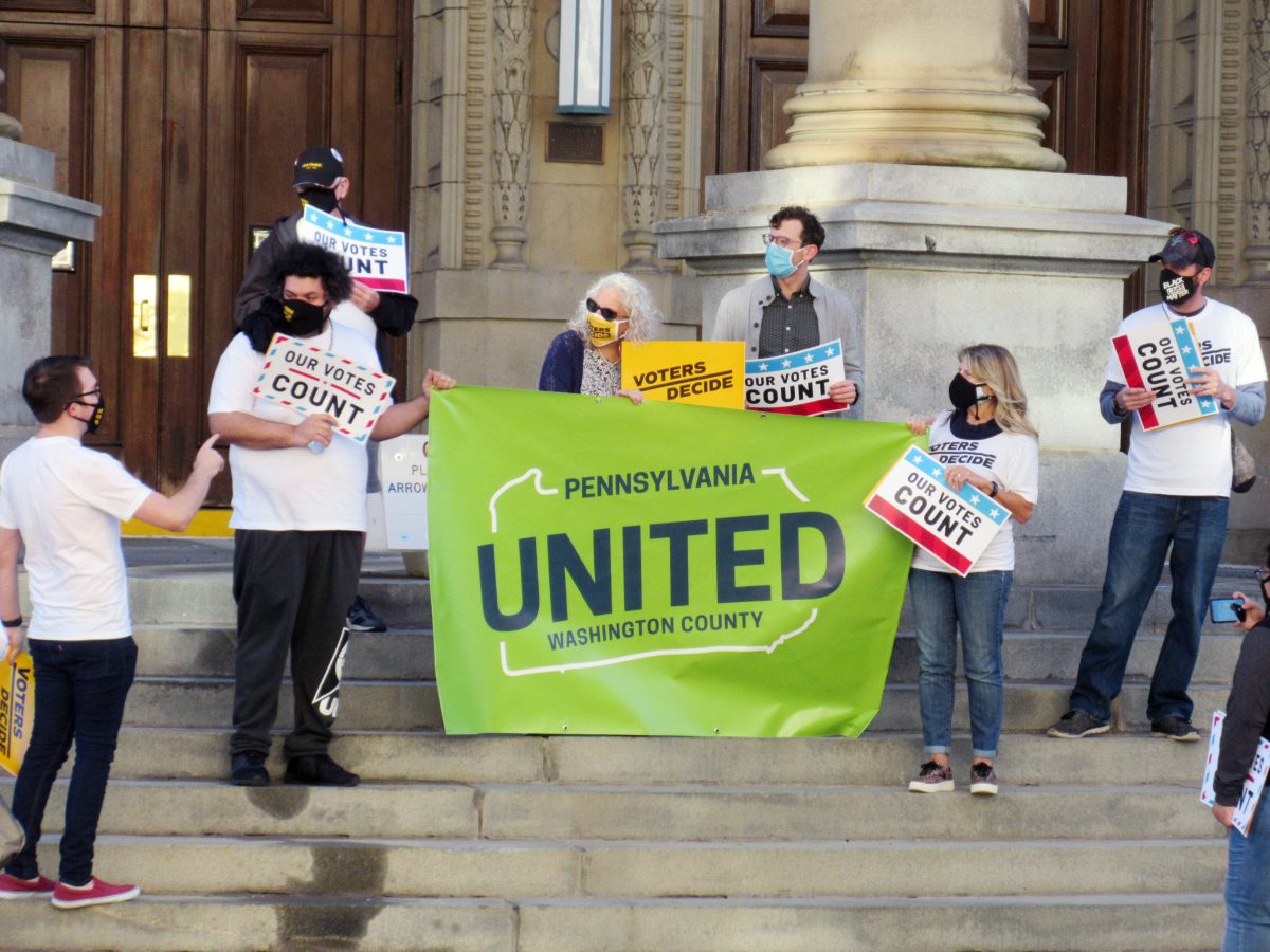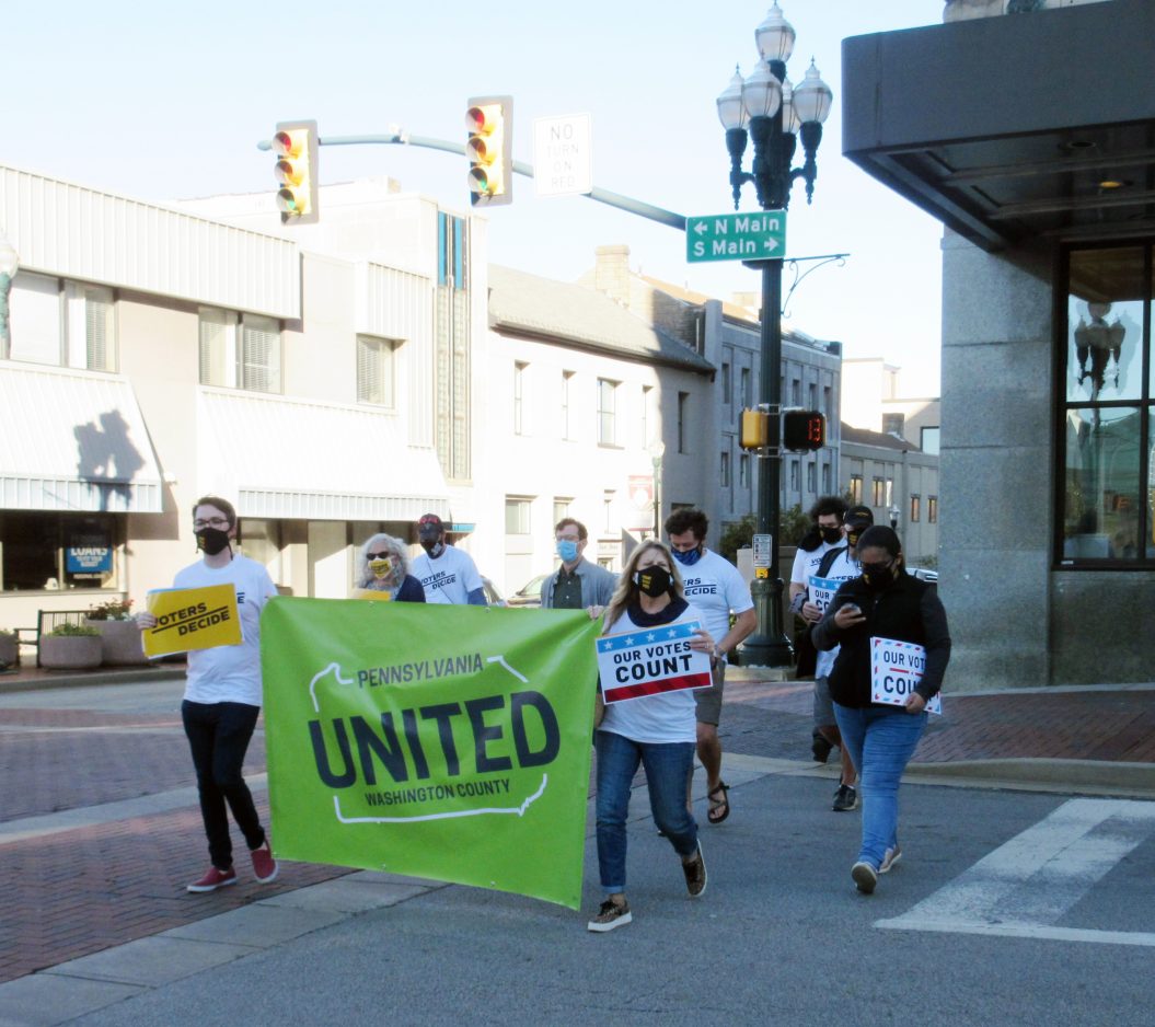 About 10 members of the Washington County United organization marched up East Beau Street to the Washington County Courthouse in Washington Wednesday afternoon to rally and demand that all votes are counted before a winner is declared in the presidential race. They held signs that said “Voters Decide” and “Our Votes Count.”