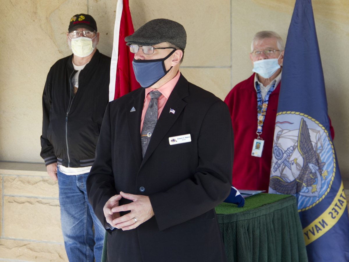 Edward Hajduk, National Cemetery of the Alleghenies director, speaks during the ceremony, flanked by Patriot Guard Riders representing branches of the U.S. Armed Services.