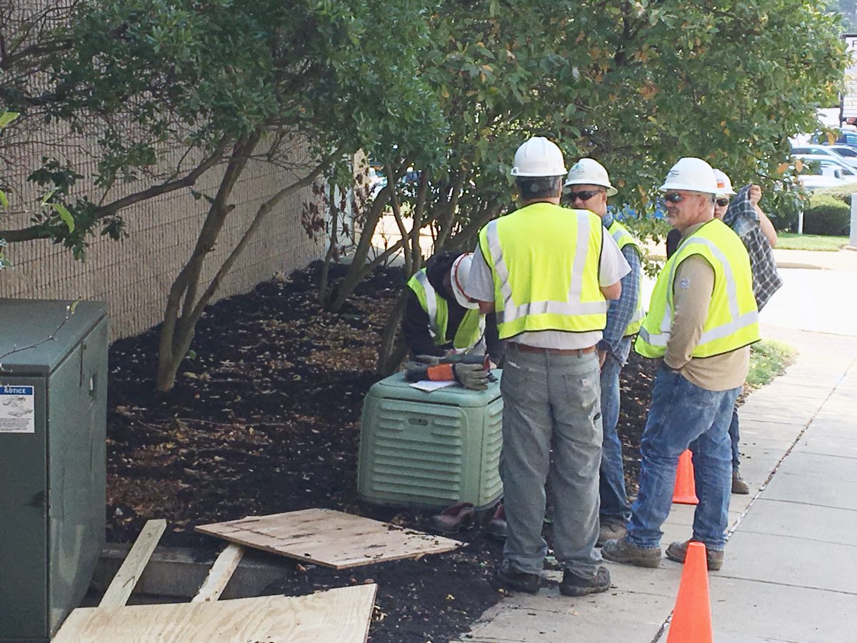 A crew from West Penn Power was summoned late Tuesday morning when it was discovered that the metal housing, known as a switchgear box, was knocked from its moorings on the West Beau Street side of the building near South Franklin Street.