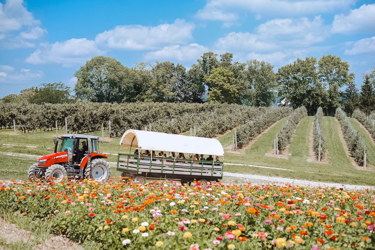 A tractor full of families and friends passes a field of pick-your-own wildflowers before parking at Triple B Farms blueberry site one sunny afternoon last week. Dozens of families enjoyed picking sunflowers, filling baskets with blueberries and peaches and running around at the farm-themed playground.