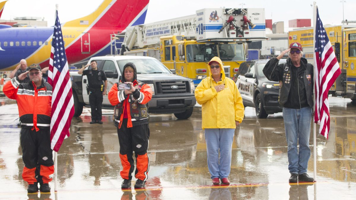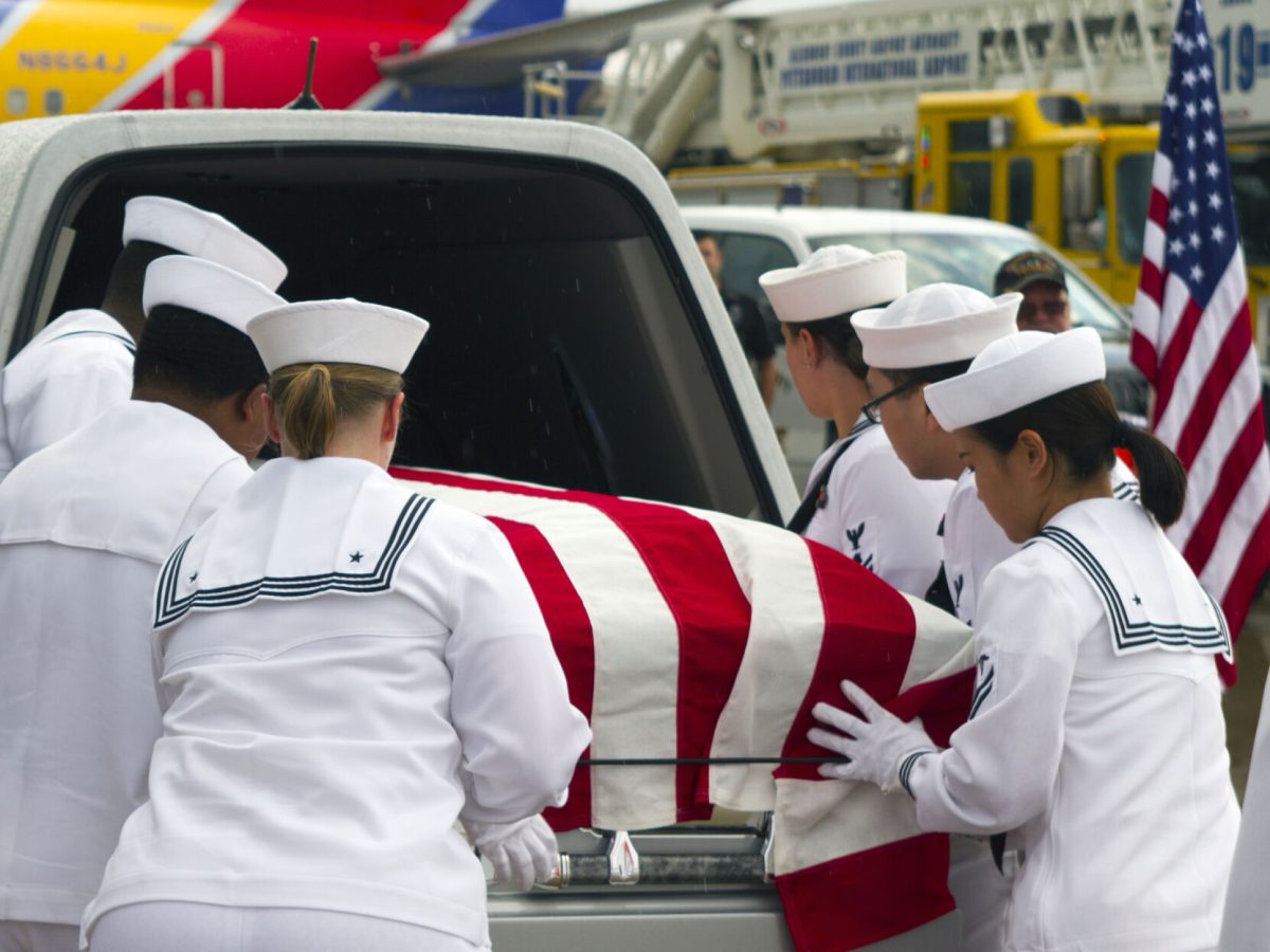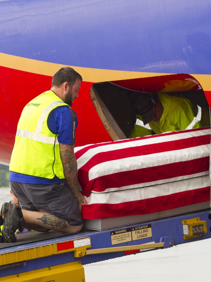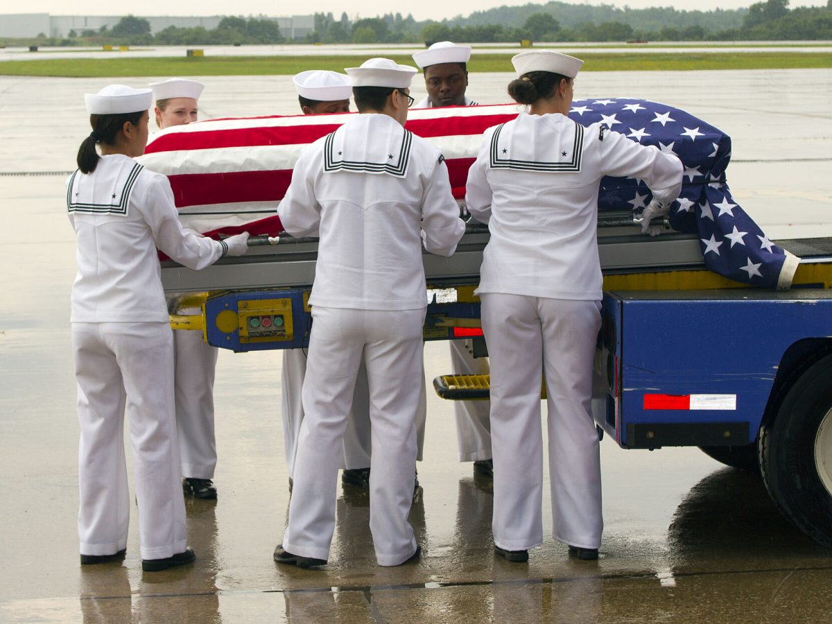 She and her husband, Harold, traveled from their home in Cortland, Ohio, to Pittsburgh International Airport Wednesday. There, a U.S. flag-draped casket bearing Drwall’s remains were taken from a Southwest Airlines jet and carried by active U.S. Navy personnel to a hearse.