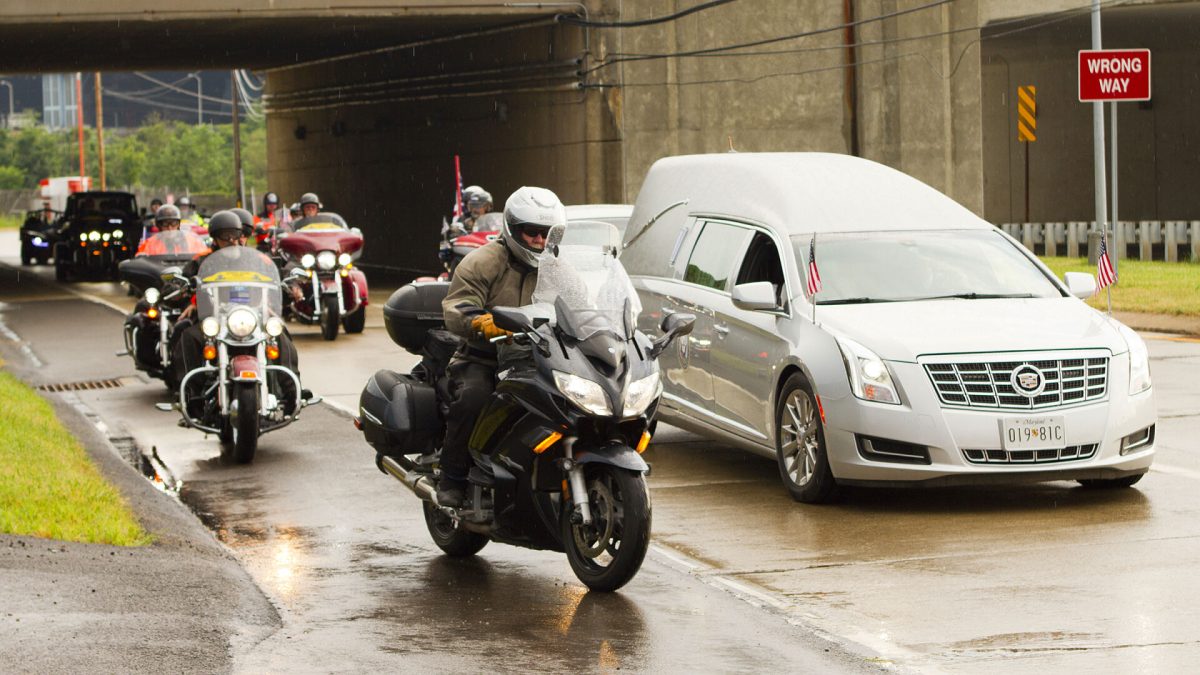 Members of the Patriot Guard Riders escort the hearse bearing the remains of Stanislaw Drwall.