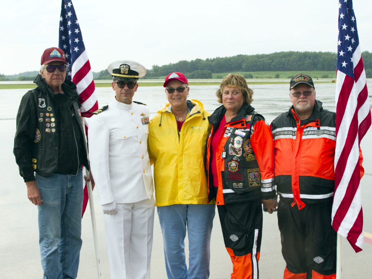 Lt. Commander Brian Pietrandrea of the Navy Operational Support Center Pittsburgh joins Patriot Guard Riders, from left, Jim Shaw, Pat Dawson, and Susan and Michael Whitlach.