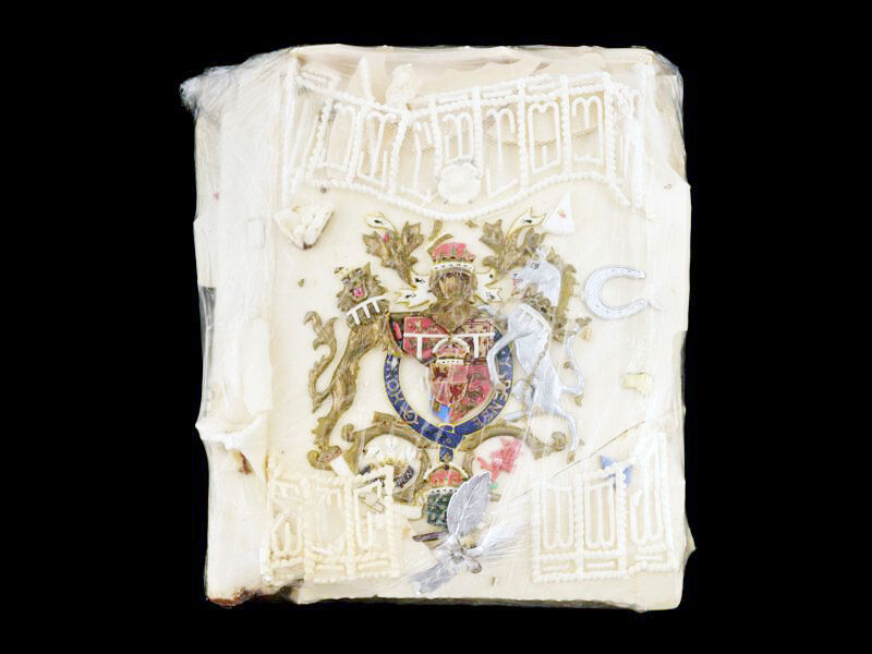 The sweet treat – a 28-ounce slice from one of 23 official royal wedding cakes baked for the event – is decorated in white icing and adorned with the royal coat of arms, a leaf spray and silver horseshoe.