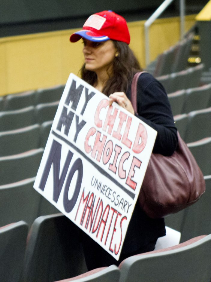 A woman carries a sign stating her position into the Peters Township High School auditorium.