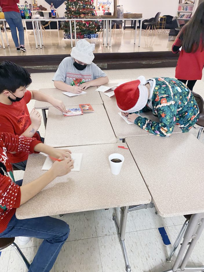 The students gift-wrapped 200 cozy socks with non-slip soles, and wrote Christmas cards to include with each gift.