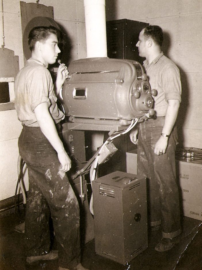 Chad Hunter’s grandfather Jack Arthur, left, operates a film projector aboard ship in 1944.