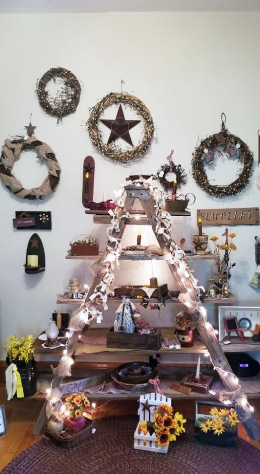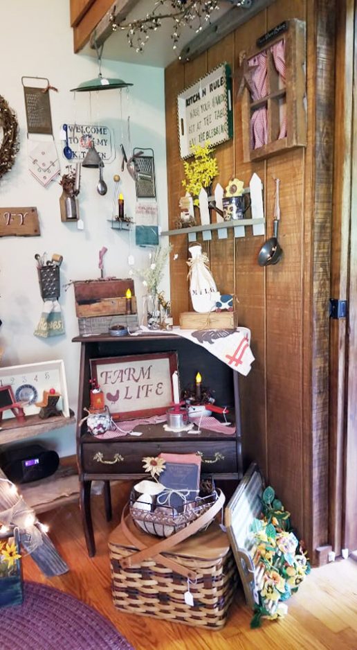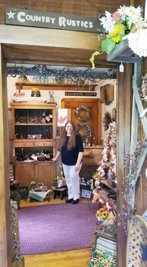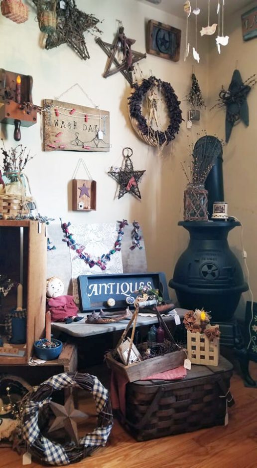 Ah, but she hopes the shop pays off. It features shelves of items that are, indeed, rustic. They include small wooden signs, glassware, wreaths, quilts, flower pots, decorated ladders – and even a pot-bellied stove.