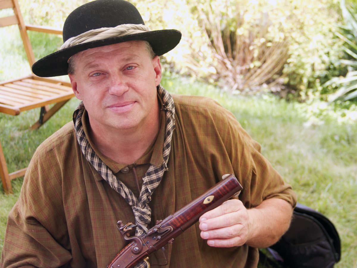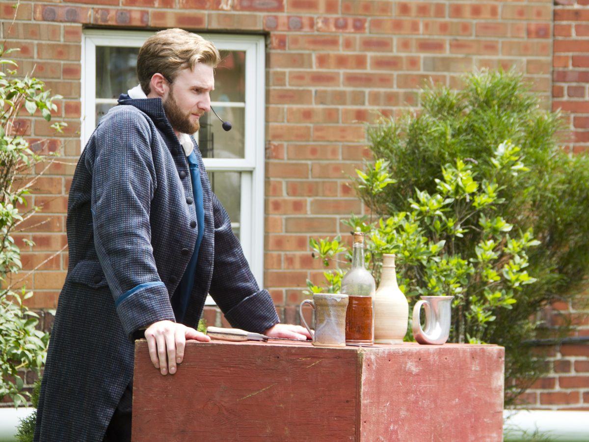 Tyler Smith performs in the reenactment of “Inglorious Rebels” by the Whiskey Rebellion Theater Troupe, presented in the LeMoyne House Garden.