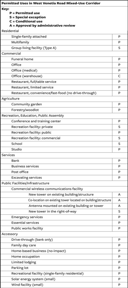 The West Venetia Road district, which extends along the south side of the road from the Nottingham Township line east to Bebout Road, was established as part of a major overhaul of the township zoning ordinance in 2017.