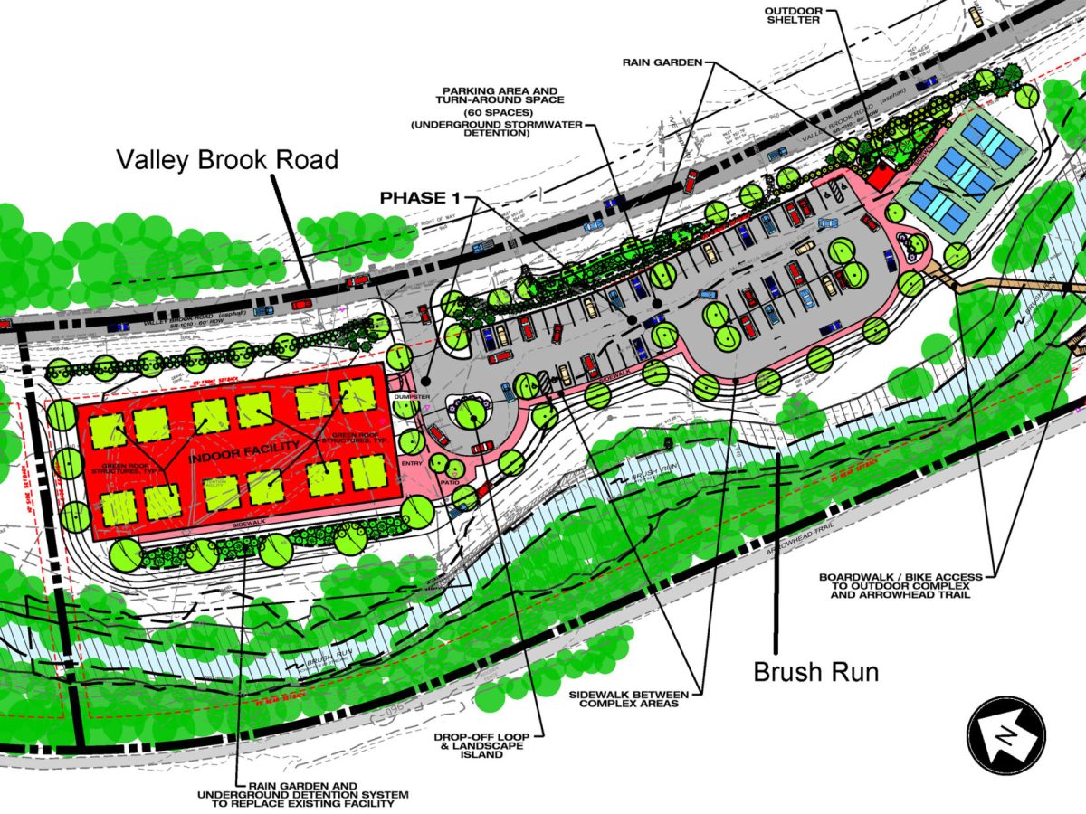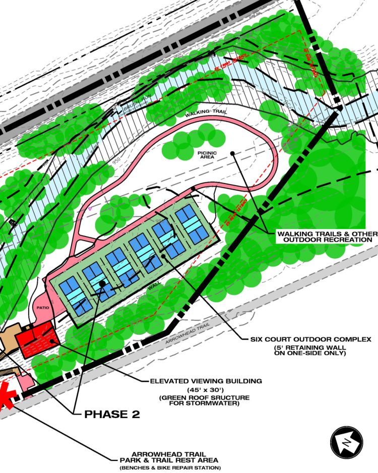 The first features construction of outdoor pickleball courts to “eventually be a covered facility,” Wetzel said, along with a boardwalk-style bridge across Brush Run providing access to the nearby Arrowhead Trail. Phase Two includes six outdoor courts, an “elevated viewing building” and walking trails.