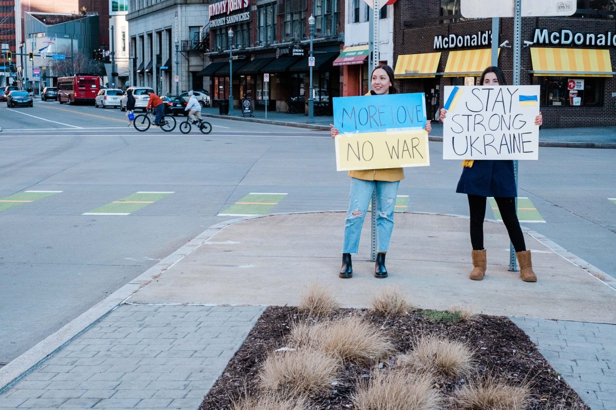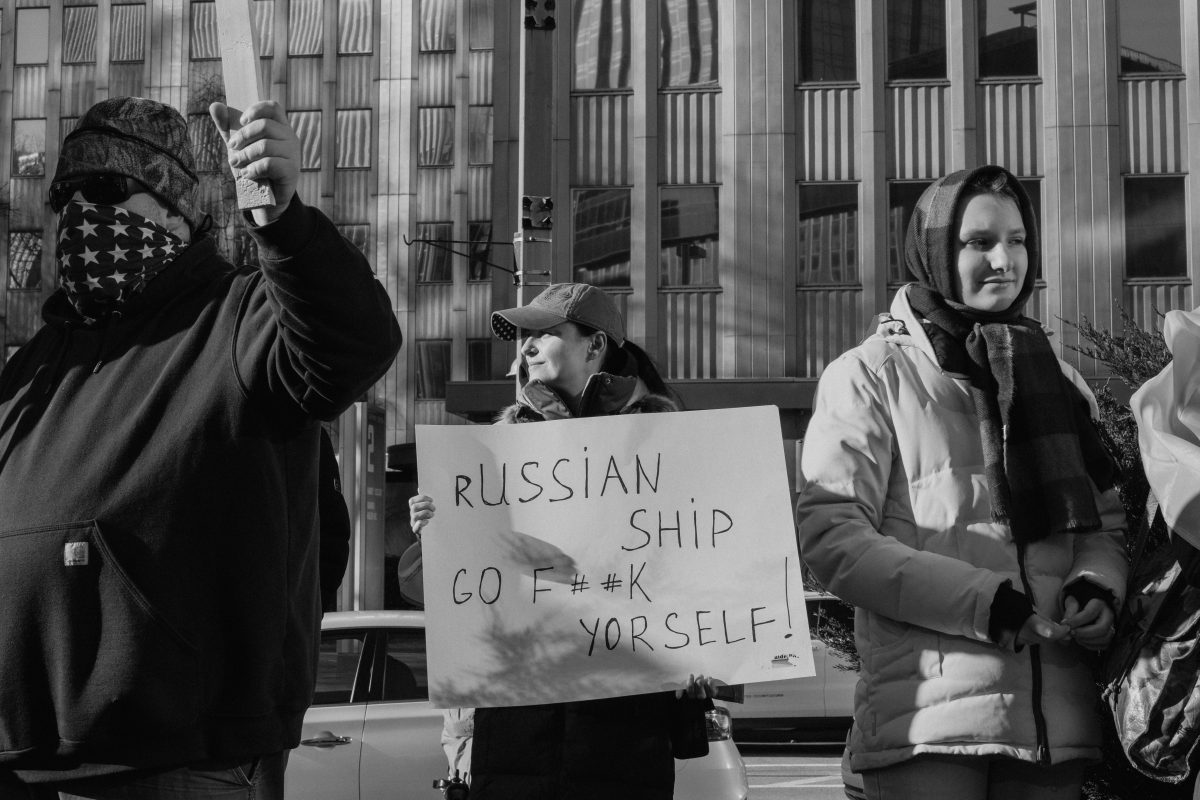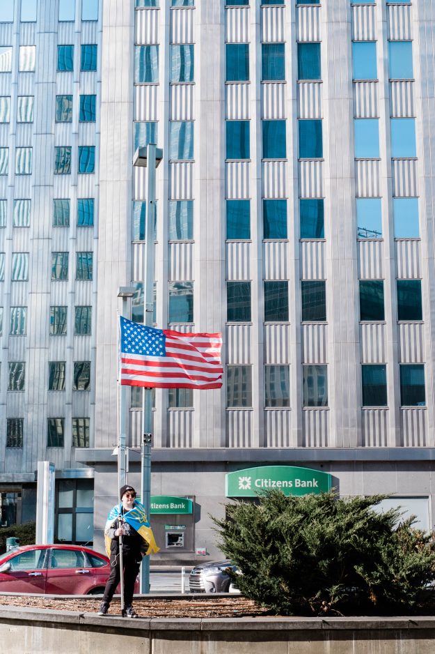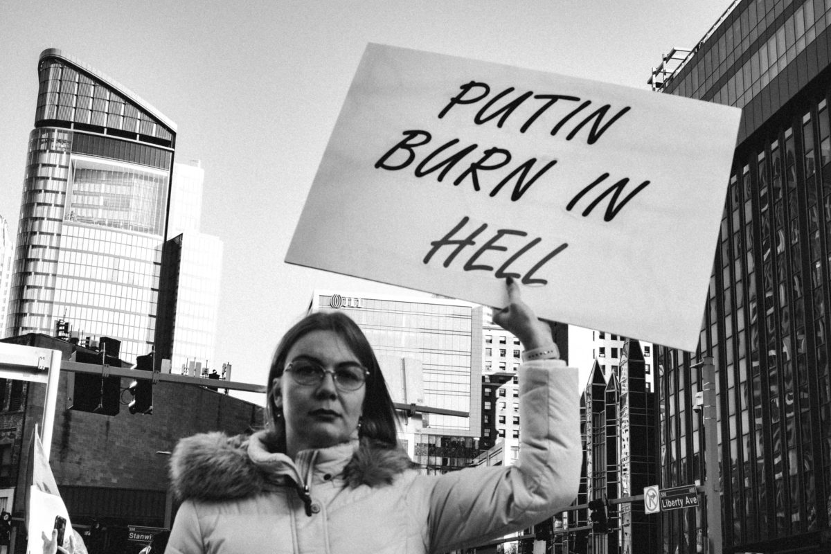 Hundreds gathered in Liberty Avenue Park, Pittsburgh, Sunday to protest Russia’s invasion of Ukraine. Peaceful ralliers brought American and Ukranian flags, relics and homemade signs to stand in solidarity with Ukraine.