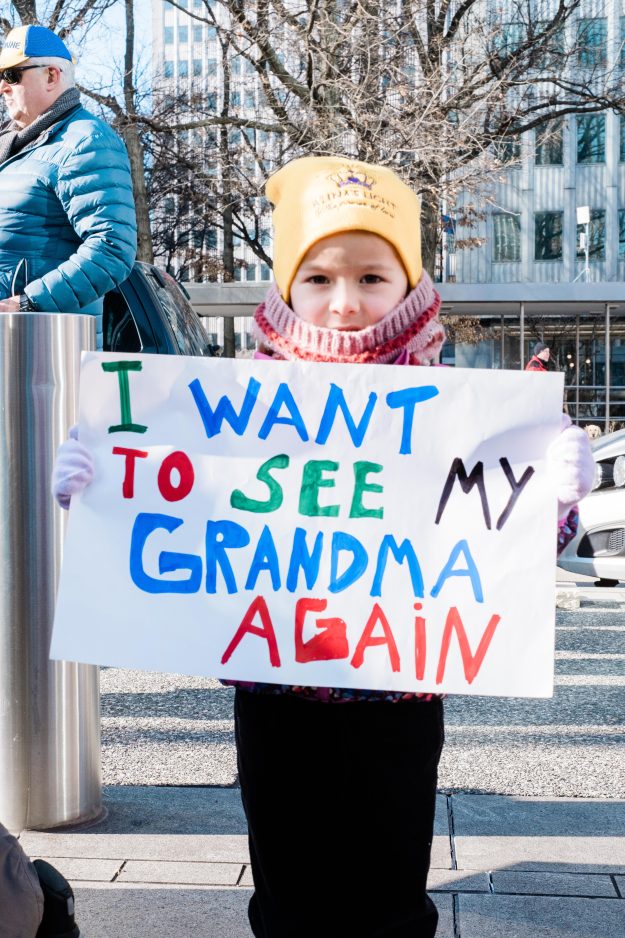 Emma Voloshyn’s grandmother lives in Ukraine, where civilians are fighting Russian troops. Voloshyn, four; her brother Mark, one; and her mother, Oksana Voloshyn, an international student, rallied with hundreds of Pittsburghers Sunday afternoon to call for peace overseas.