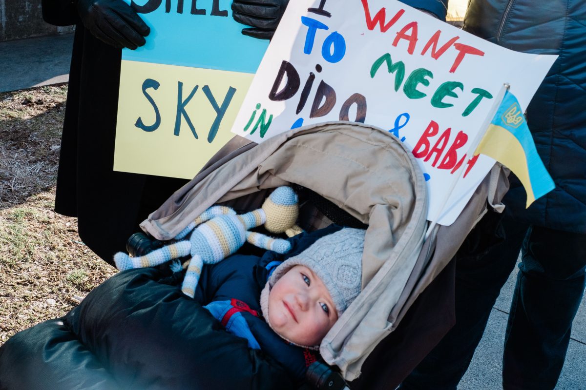 Mark Voloshyn, one, has never met his grandparents, who both live in Ukraine. Mark and his sister Emma, four, attended the rally in Liberty Avenue Park Sunday with their mom Oksana Voloshyn, where Ukranian-Americans and allies called for peace overseas.