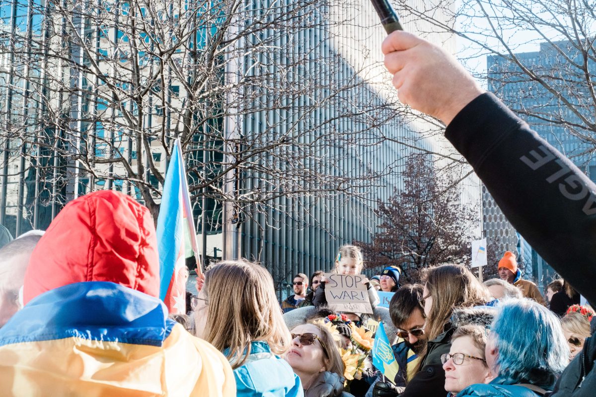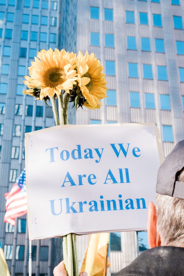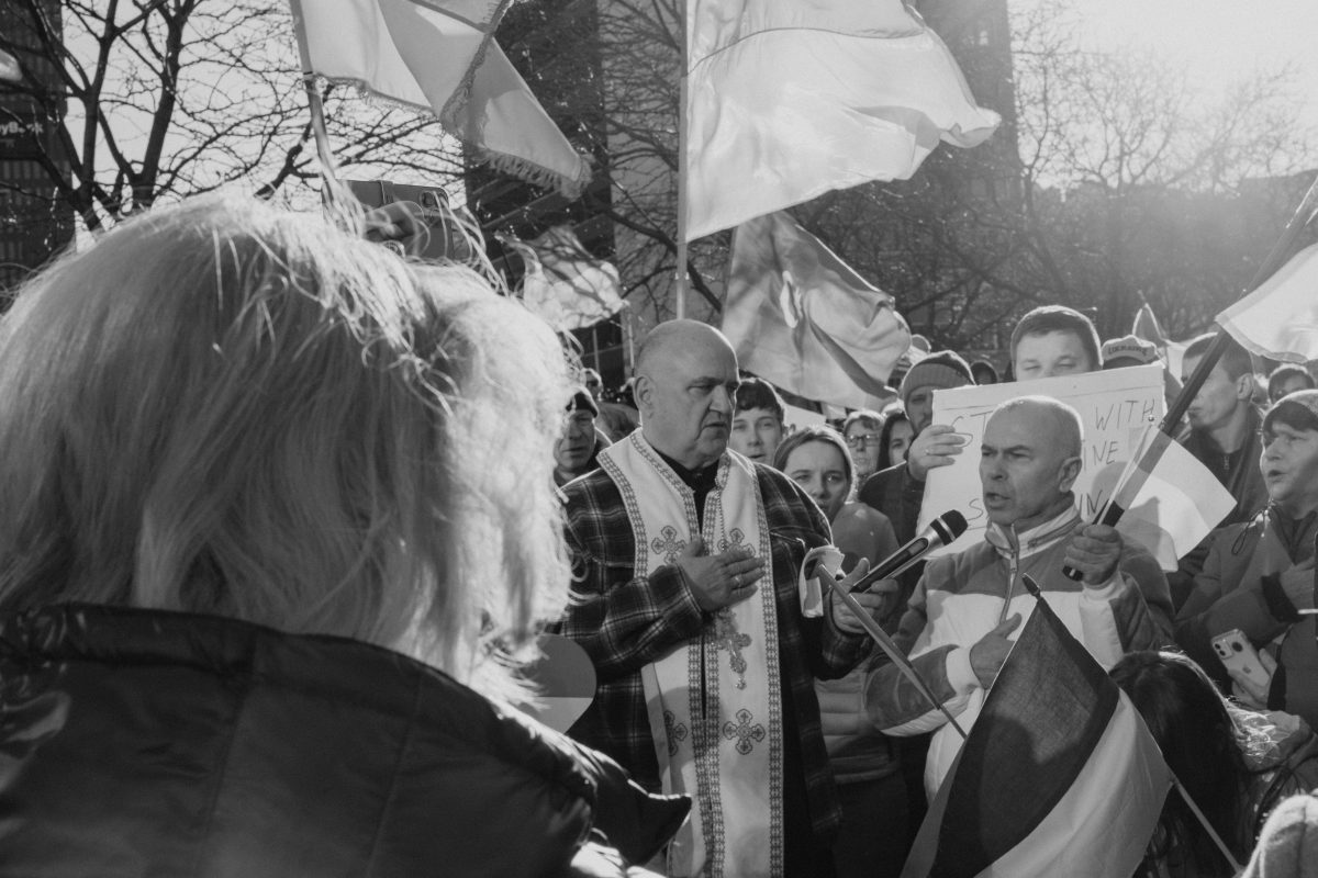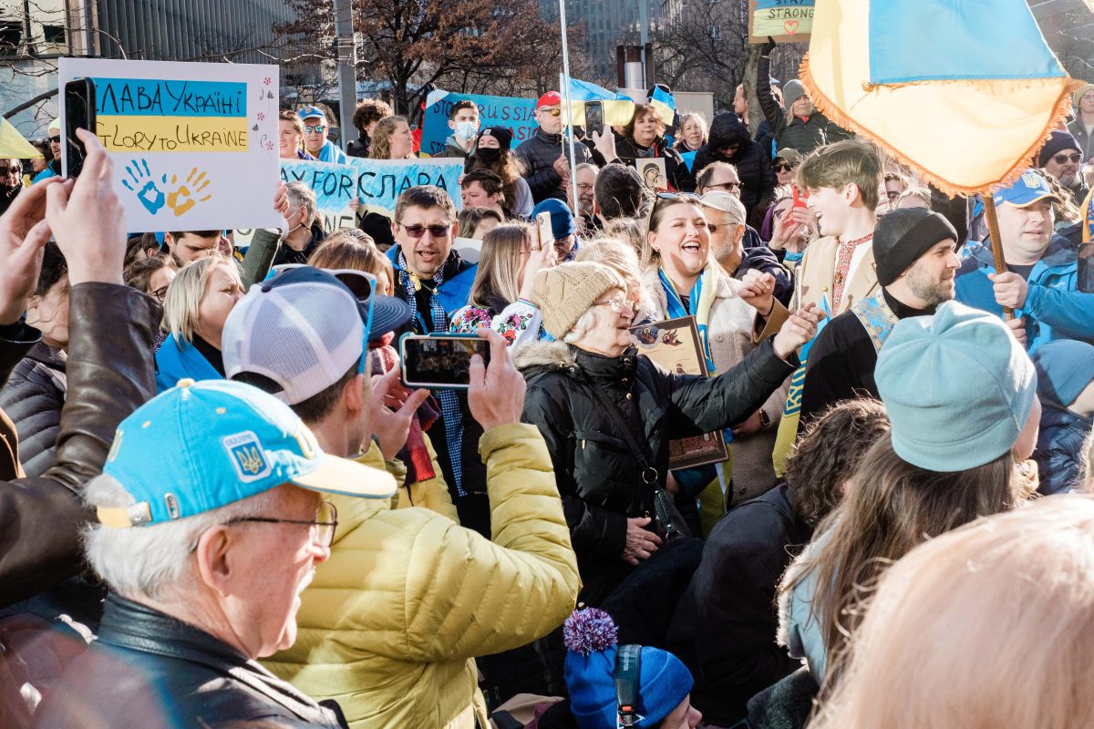 Sunflowers – the Ukranian national flower – were in abundance at Liberty Avenue Park Sunday, where hundreds gathered to show support for Ukraine. Attendees sang, prayed, chanted and delivered moving speeches at the peaceful rally.