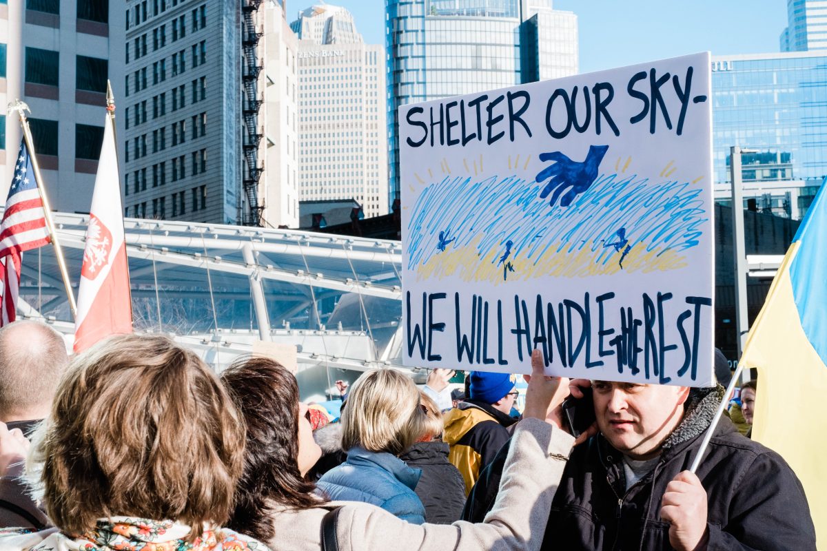 Protesters chanted, “Shelter our skies” at a rally in downtown Pittsburgh Sunday afternoon. Hundreds turned out to stand in solidarity with and pray for Ukraine.