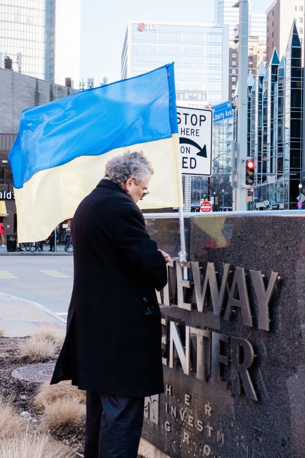 A peaceful rallier tapes the Ukranian flag to the Gateway Center sign in downtown Pittsburgh Sunday afternoon. The Ukranian flag’s blue symbolizes wide blue skies, while the yellow represents the nation’s wheat fields.