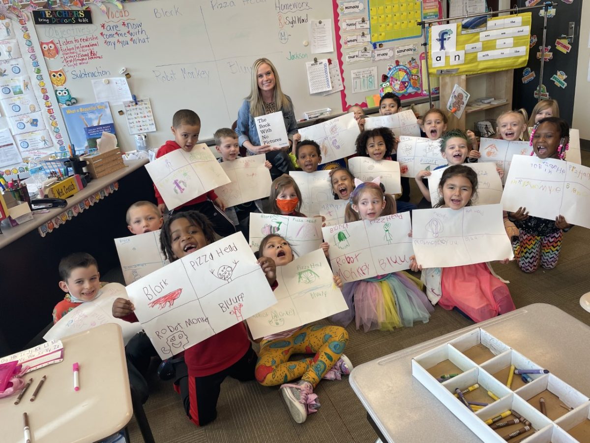 Students in kindergarten through third grade also enjoyed reading the engaging and funny “The Book with No Pictures,” written by B.J. Novak of “The Office” fame and filled with silly words like Boo Boo Butt and and Glurr Ga-Wocko. Children then picked four words and drew pictures of them.