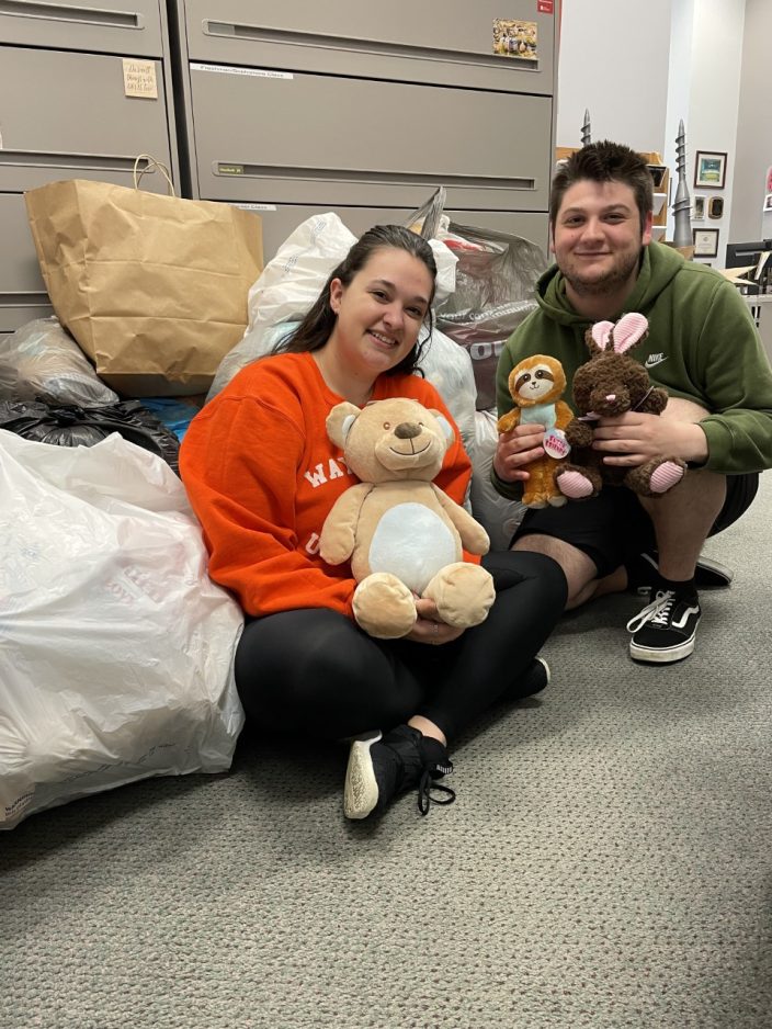 Since there were too many to be stored at Steimer’s Claysville home, the stuffed animals have found their way to the university’s Southpointe campus. Many Waynesburg staff and faculty members, as well as students, have contributed.