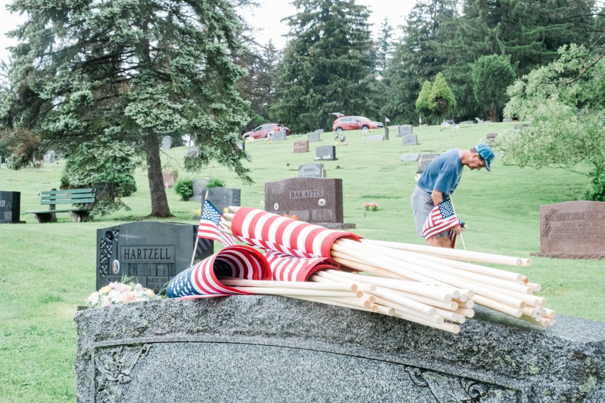 Retired servicemen and their spouses, community volunteers and local organizations spent Friday decorating 5,500 veterans’ graves in Washington Cemetery. About 70 volunteers attended the rainy event, led by American Legion Post 175.