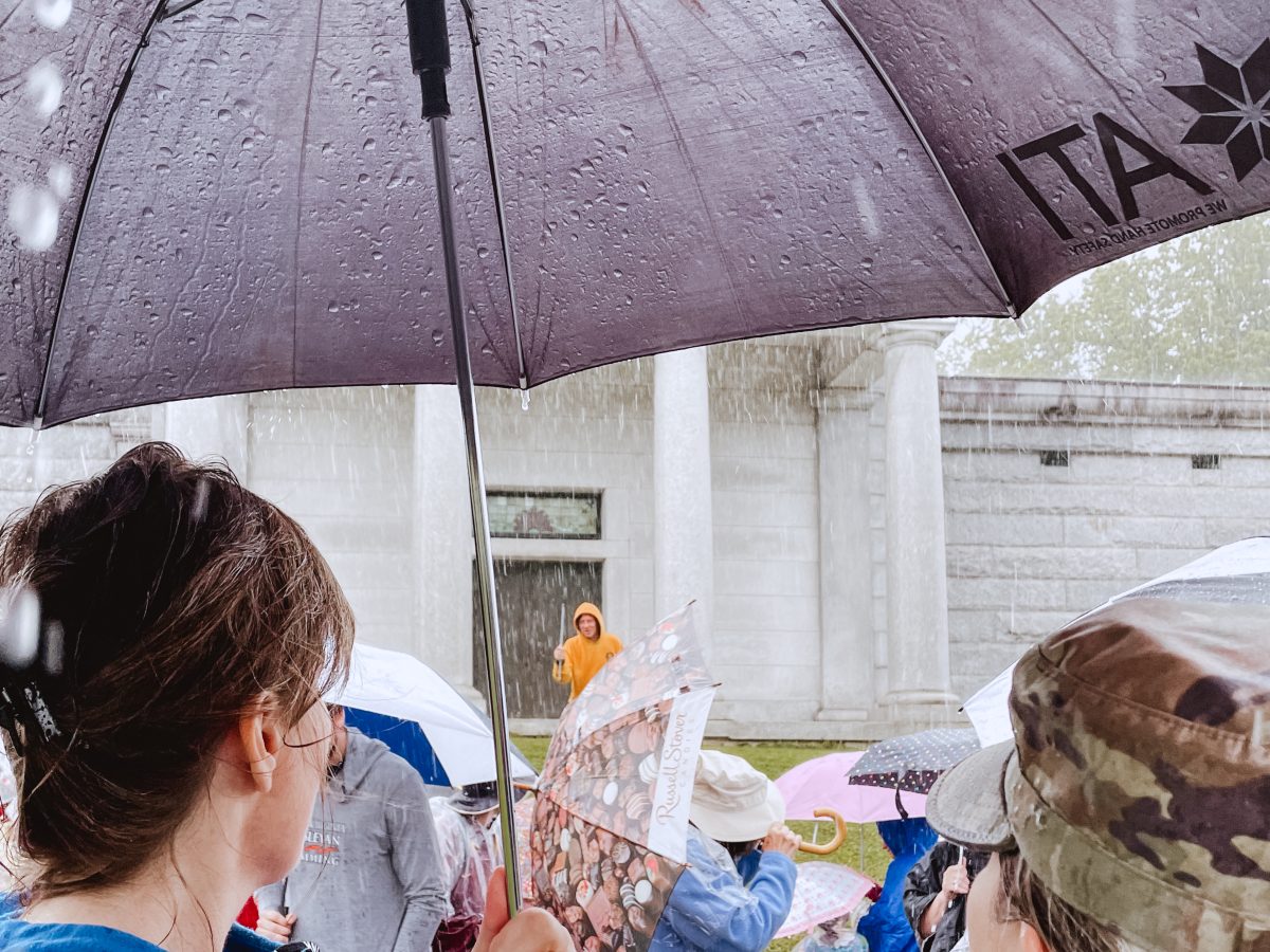 Washington Cemetery was a sea of umbrellas Friday morning, when about 70 volunteers gathered in a heavy downpour to place flags on veterans’ graves ahead of Memorial Day weekend.