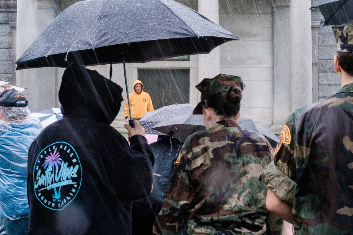 Miles Glotfelty welcomes volunteers to the annual flag detailing in Washington Cemetery Friday morning. Though Glotfelty offered to postpone the grave decorating until noon, many volunteers braved the rain and laid flags before skies cleared around lunchtime.