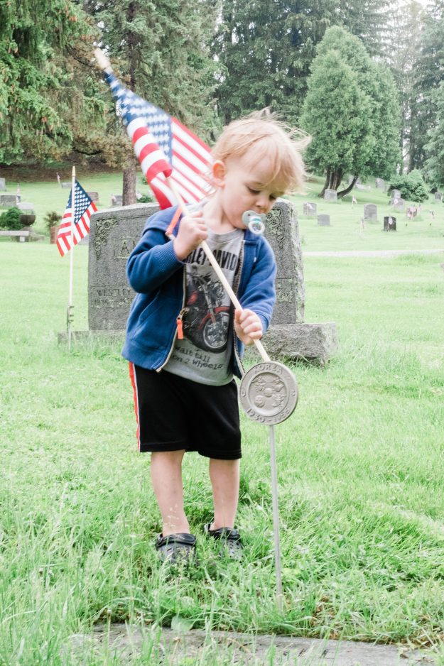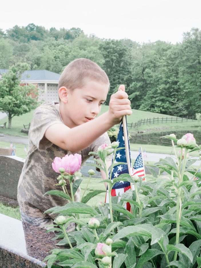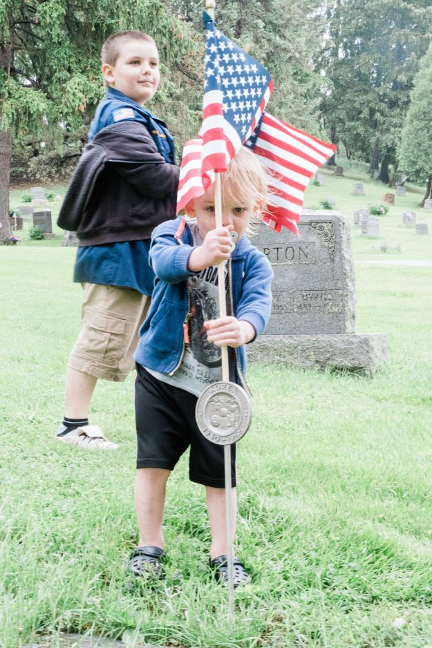 Two-year-old Kash Patterson places a flag nearly as big as he is on a veteran’s grave in Washington Cemetery. Patterson and his brother, Zander, a Boy Scout with Troop 1103, spent Friday afternoon decorating veterans’ graves with their parents, Danielle and Matt Patterson.