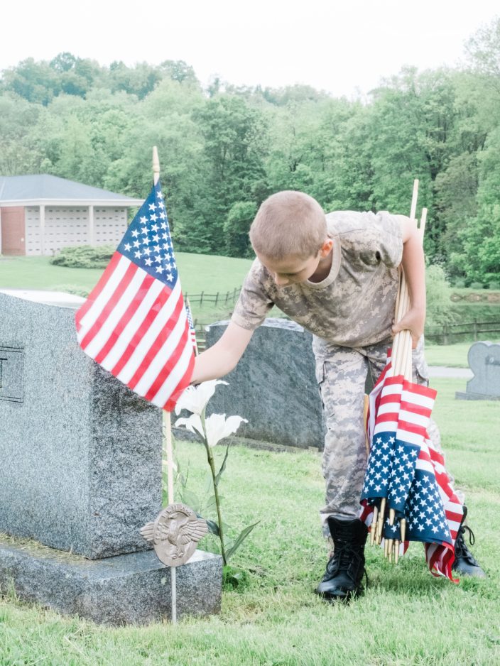 Maximus Wright, a member of Cub Scouts Pack 1103, decorates a grave in Washington Cemetery Friday afternoon. Maximus’s mother Ashley Wright, cub master, carried flags while her son scouted for empty markers.