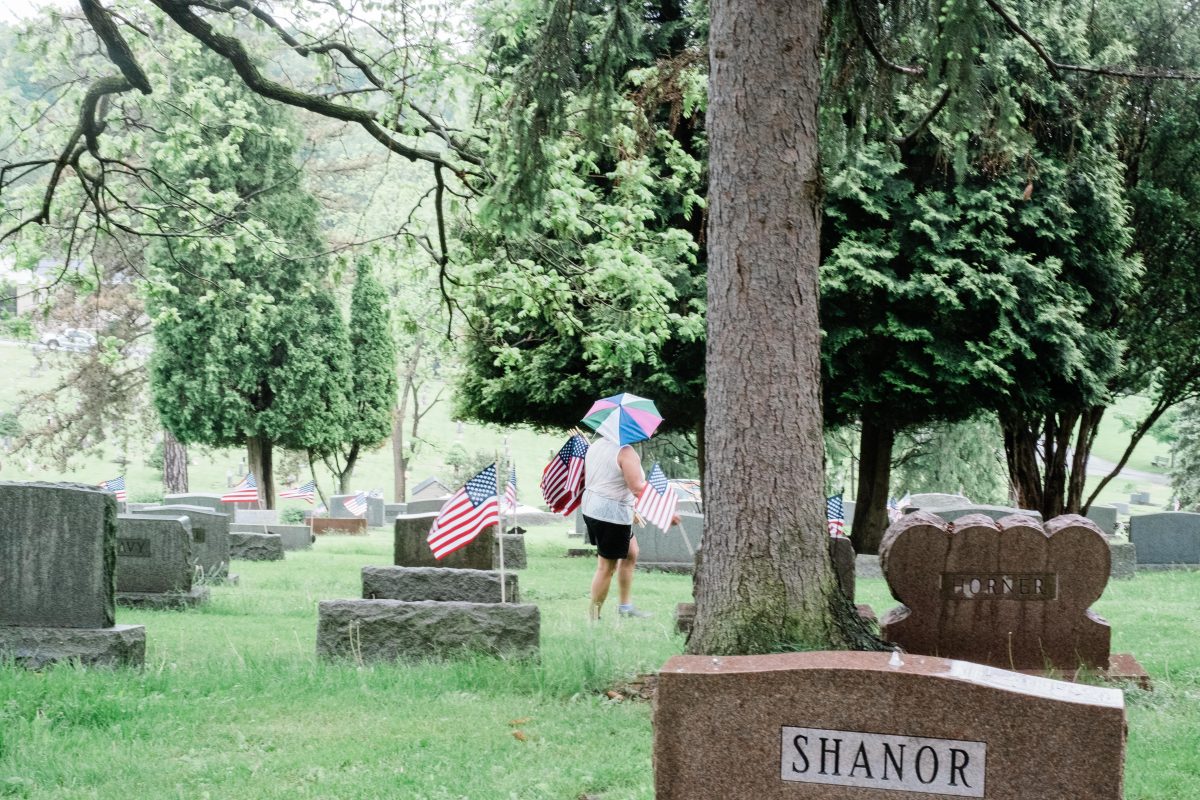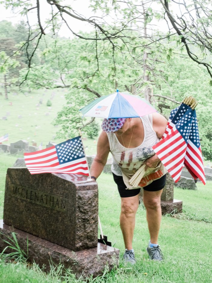 Though event leader Miles Glotfelty, retired Army and member of Post 175, pushed the 9:30 a.m. flag detailing back until noon, more than half the volunteers opted to get to work early Friday morning, dashing between raindrops to decorate graves. Some folks sought shelter from the storm and returned to finish the work when the skies cleared around lunchtime.