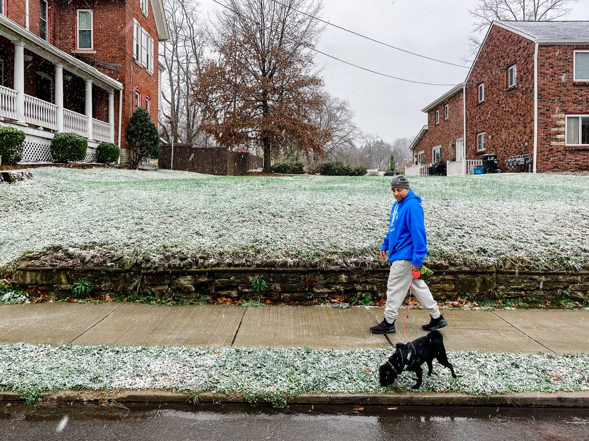 Scott Doverspike and his puppy, Boomer, too, were undeterred by the specks of white floating down from a gray sky, and stepped out – bundled up, of course – for their afternoon walk.