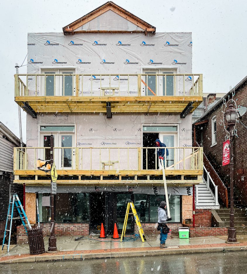 The snow doesn't bother Toby Fonner, who hoists wood slats up to JLD Construction co-worker David Kriston. The two men, both of Washington, spent Tuesday working through snowflakes in downtown Canonsburg.
