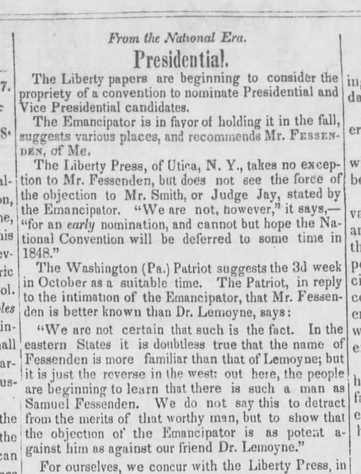 LeMoyne himself said, “In view of the circumstances of the case, I feel constrained to accept the nomination, and thus affording abolitionists to bear an open testimony in favor of freedom, and administer a friendly and fearless rebuke to the pro-slavery politicians of the day, and to consistent professing friends of the slave.”