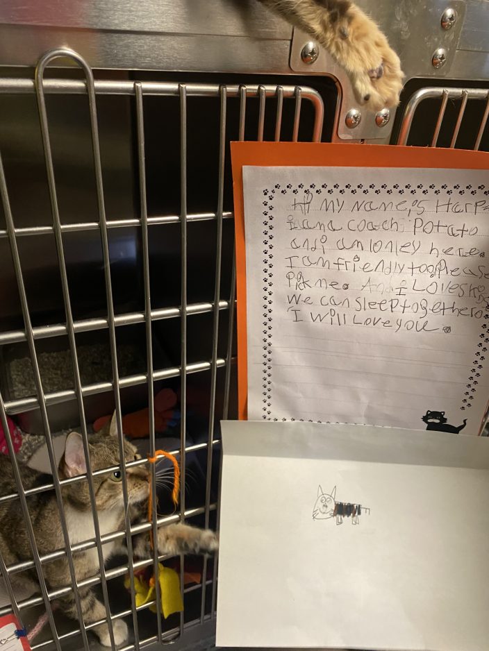 “Miss Hillsman found a resource that had something to do with the humane society. She was thinking about doing something with that as a warm-up for her classes,” said Bell. “I saw something where someone was writing letters. (Hillsman) just had brought the idea of partnering to my mind – maybe if we reached out to the humane society, they’d let us hang these letters on (the animals’) crates. We all love animals; we feel this is something that’s close to our heart.”