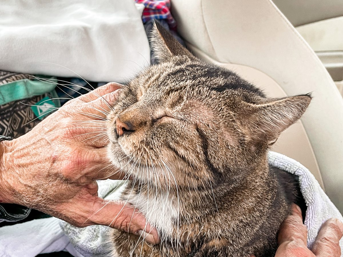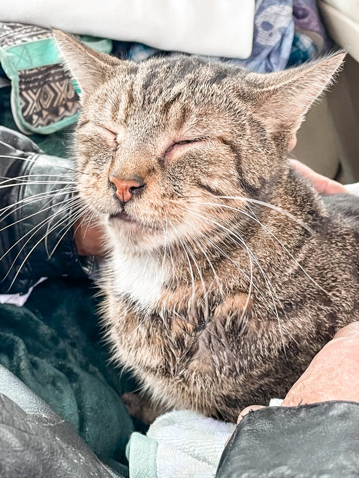 Precious recovers in a car after crews rescued her from a house fire in Union Township Friday morning. Four residents and the cat escaped with minor injuries.
