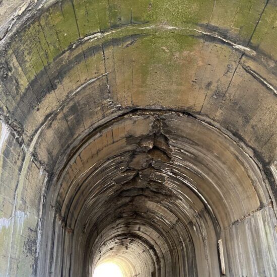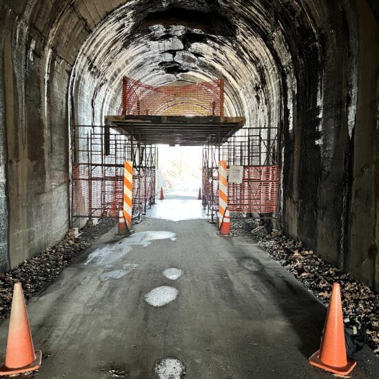 At mile marker 28.7 (nearly the halfway point of the trail), the 110-year-old tunnel has slowly been deteriorating, so volunteers erected a temporary scaffold-and-plywood shield to safeguard walkers, runners and bikers from debris detaching from the ceiling.
