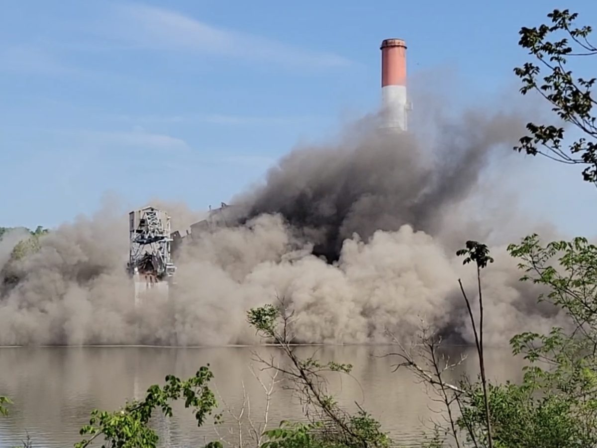The demo attracted crowds of people who gathered on railroad tracks across the river as simultaneous blasts erupted at the base of the power plant at exactly 9:37 a.m., followed by shock waves that reverberated across the water before most of the main building and several smokestacks came tumbling down.