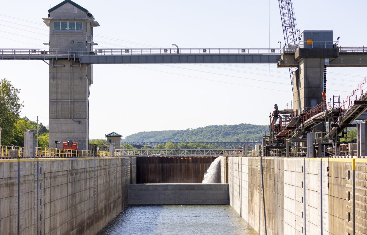 “It provides industry with a more efficient means of transporting goods up and down the river,” Dine explained. “If a tow is pushing six barges up in two rows, they need to break that apart because they can only fit three barges through the chamber. You’re looking at an hour-and-a-half to two hours to get six barges through. Once we have this chamber operational, industry will be able to push those six barges through in about 30 minutes. That’s going to save industry a lot of time and money.”