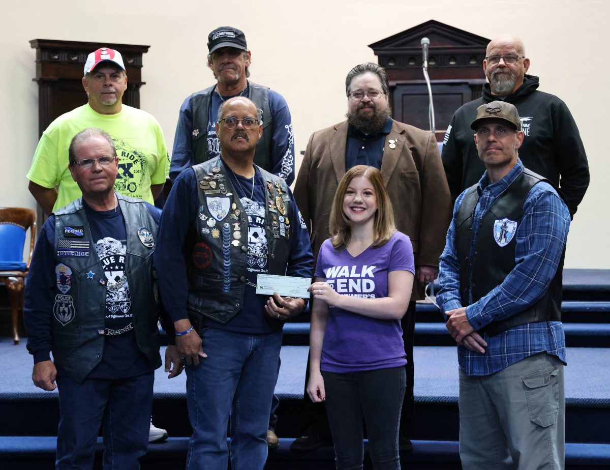 The Blue Knights Law Enforcement Motorcycle Club Chapter 16 recently presented a check for $1,000 to the Alzheimer’s Association. This was part of the proceeds from the 20th Annual Blue Ride that was held earlier this year. The ride was a joint effort between the Blue Knights and Washington Lodge No 164 Free and Accepted Masons.