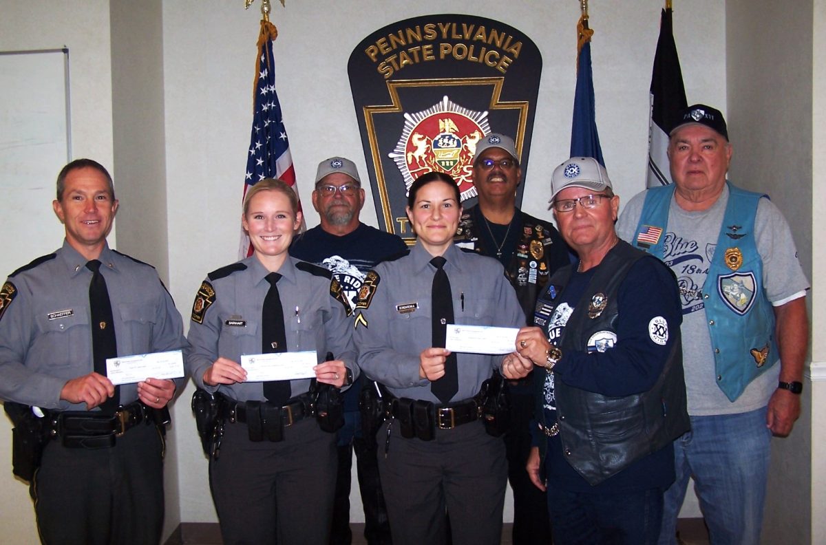 The Blue Knights Law Enforcement Motorcycle Club Chapter 16 recently presented a check for $2,000 to Gifts for Kids in Fayette County, and $1,000 each to Allegheny County Camp Cadet and Troop B Camp Cadet. The programs are sponsored by the Pennsylvania State Police. The donations are part of the proceeds from the 20th Annual Blue Ride.