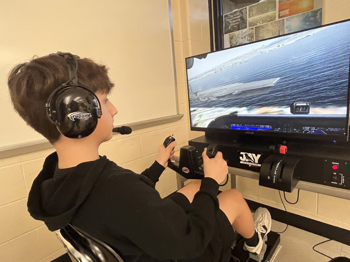 Bentworth Middle School student Calen Antanovich, sitting in the pilot’s seat with hands on the yoke, banked the Cessna airplane to the left and lined the aircraft up to land on the carrier.