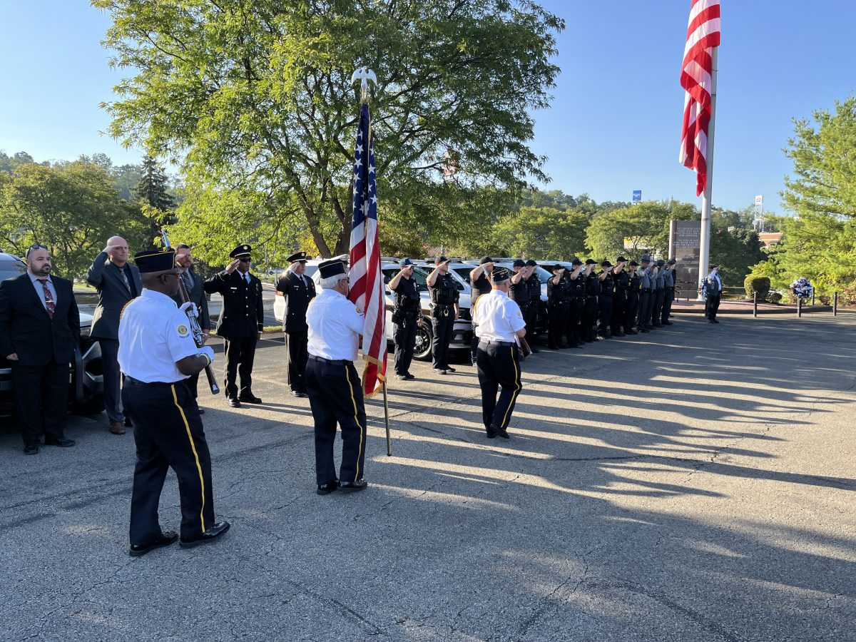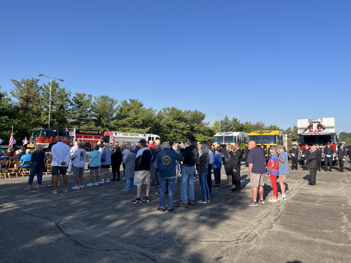 A large crowd consisting of the public, firefighters, police officers, EMTs and state troopers gathered in the parking lot of the Washington Mall off of Oak Spring Road to recognize the 23rd anniversary of 9/11. That morning, two planes were hijacked by terrorists and flown into the World Trade Center buildings in New York City.